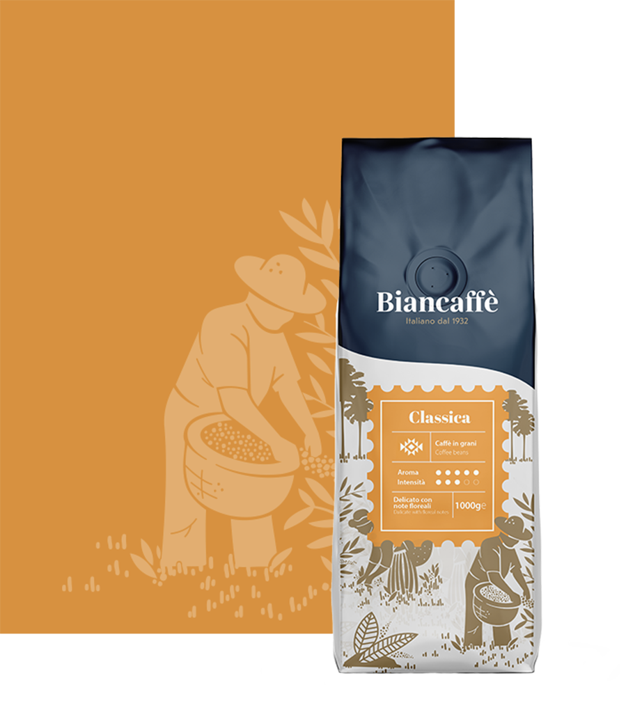 d'Arabica et de Robusta de qualité supérieure, provenant de petites exploitations d'altitude d'Amérique du Sud et d'Afrique du Sud, cultivées exclusivement en agriculture biologique, sans engrais chimiques ni pesticides. Classica Bio est un mélange qui offre un équilibre parfait entre saveur, onctuosité et corps. Son arôme riche et distinctif nous transporte vers des contrées et